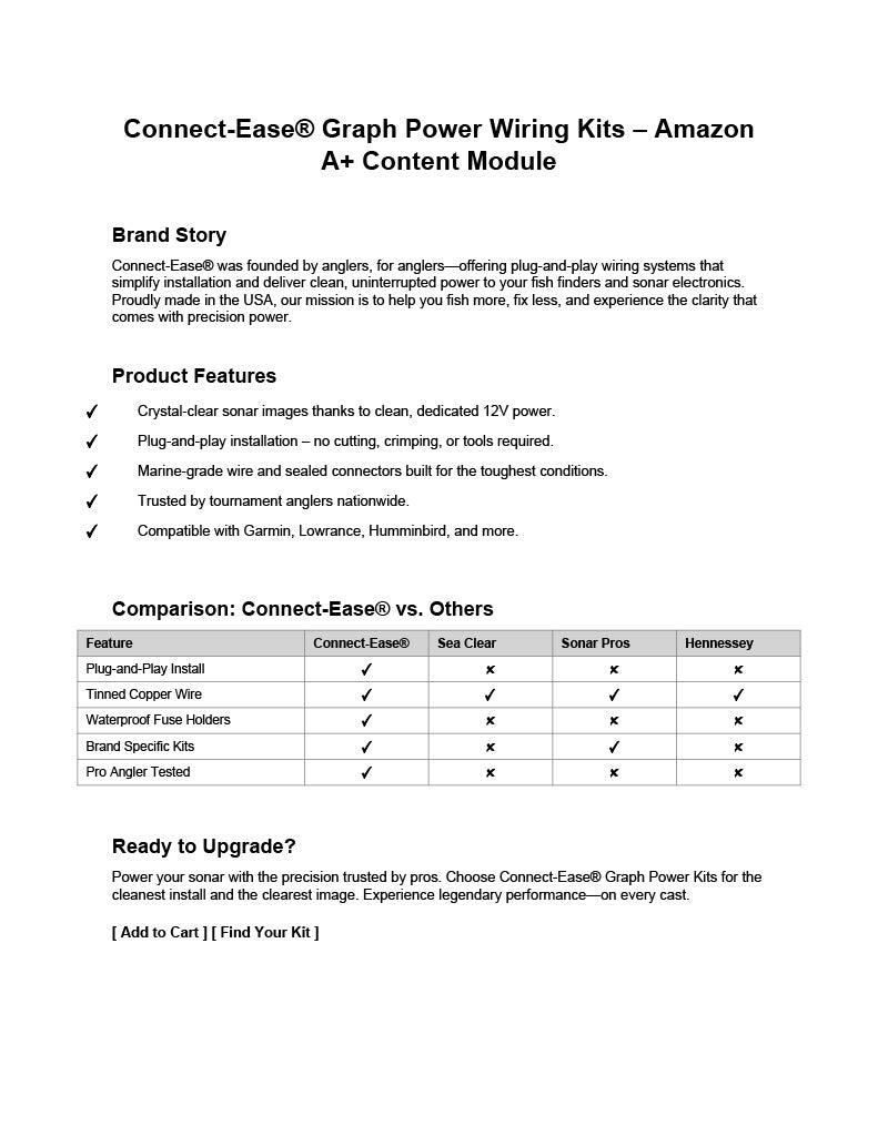 and bow electronics. CONNECT-EASE uses the best marine-grade connections and heat-shrinkable crimped connections that are waterproof, reject RF interference, and stay